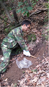 雖未至伏月,但艷陽高照的五月天仍是酷熱難當,加上工作區相對高差普遍在400m左右,地勢陡峭,灌木叢生,給野外工作帶來了較大困難。但是沒有一位同志退縮,大家依舊不畏辛苦地穿越在高山密林之中,攻堅克難,保證質量地完成了每天的任務。化探組組長趙渭河每天保持一副“樂呵呵”的面容,主動要求跑最長的路線,回基地后還堅持負責樣品的清點與記錄,深深感染了我們,讓我們年輕技術員甚為欽佩,是我們學習的榜樣。