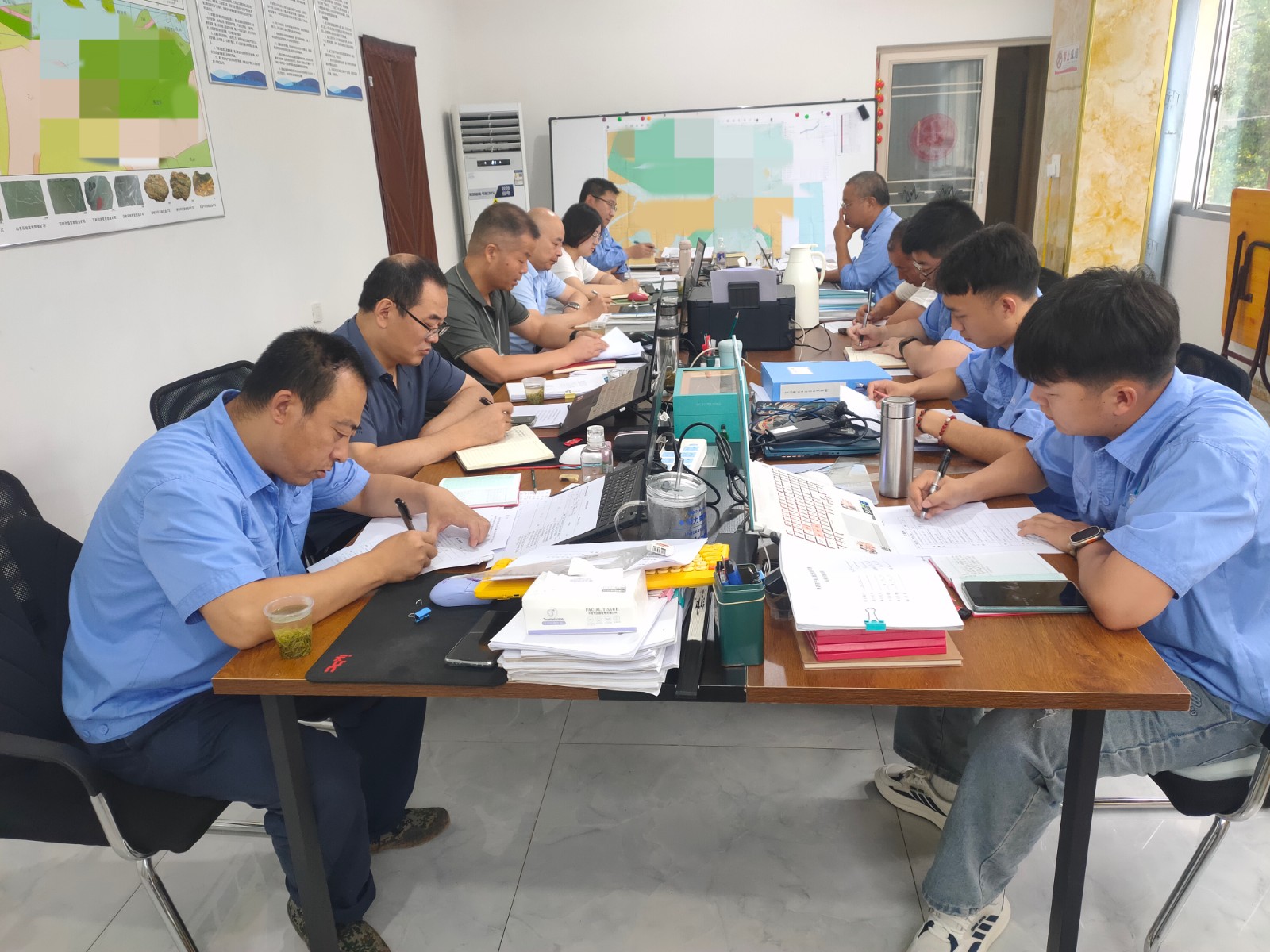 楊昭一行先后深入公司物化探院寧強大地質項目部和地調院黃泥坪項目部,首先向項目全體人員表示親切慰問,為大家送去了防暑降溫慰問品;隨后,冉軍林對項目安全體系建設、雙重預防機制、安全教育培訓、班前“5分鐘”等落實情況進行了檢查指導;技術質量部詳細檢查了兩個項目的技術質量工作。