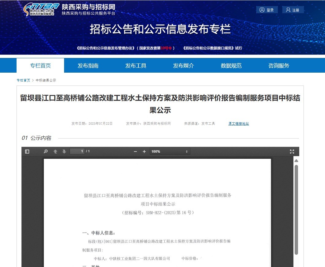 7月22日,從陜西采購與招標網傳來喜訊,公司成功中標《留壩縣江口至高橋鋪公路改建工程水土保持方案及防洪影響評價報告編制服務項目》。